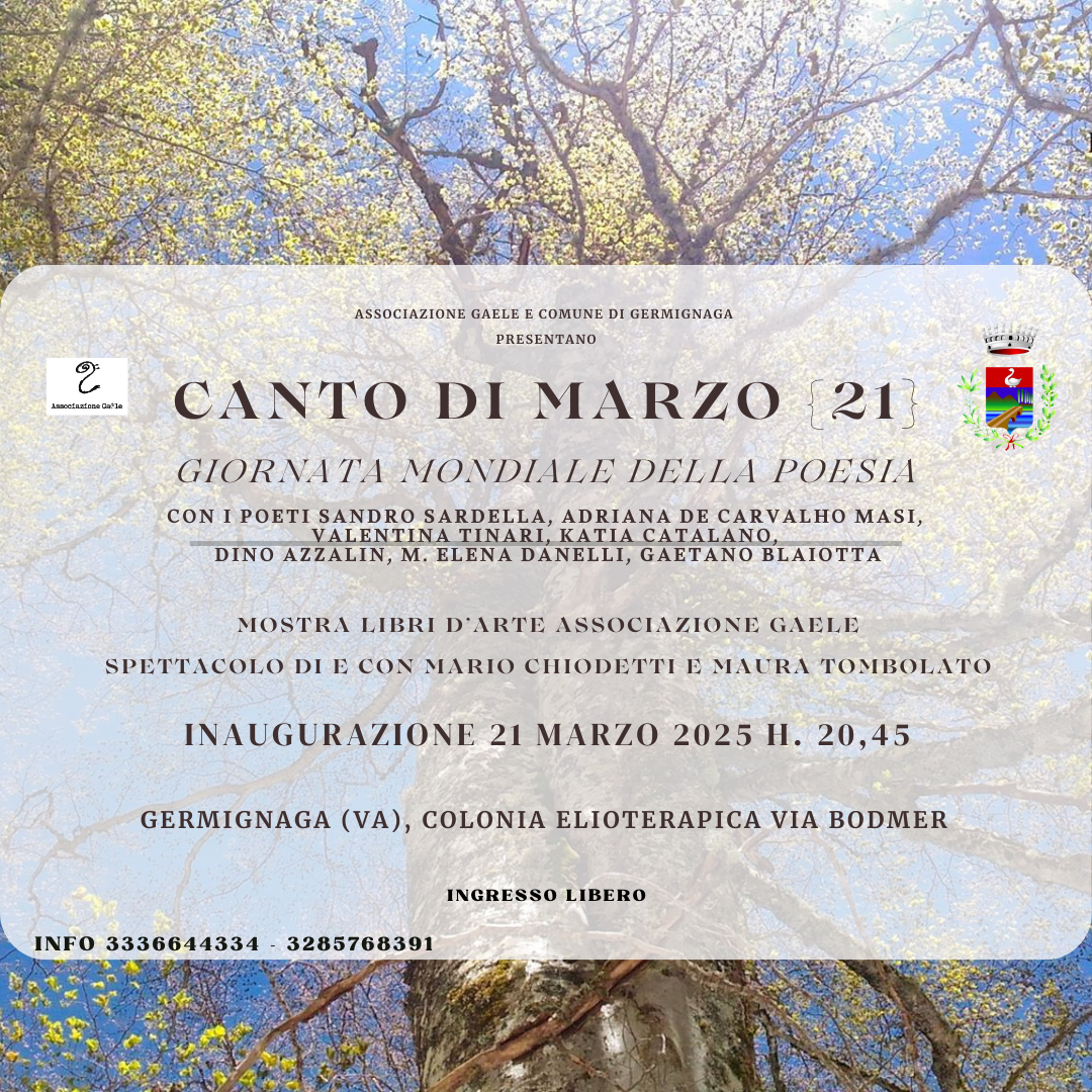 Descrizione Vedi allegati Allegati Documenti Canto di marzo [.pdf 159,19 Kb - 03/03/2025] Giornata mondiale della Poesia 21 Marzo 2025 [.png 2,52 Mb - 03/03/2025] Ultimo aggiornamento pagina: 03/03/2025 12:05:33
